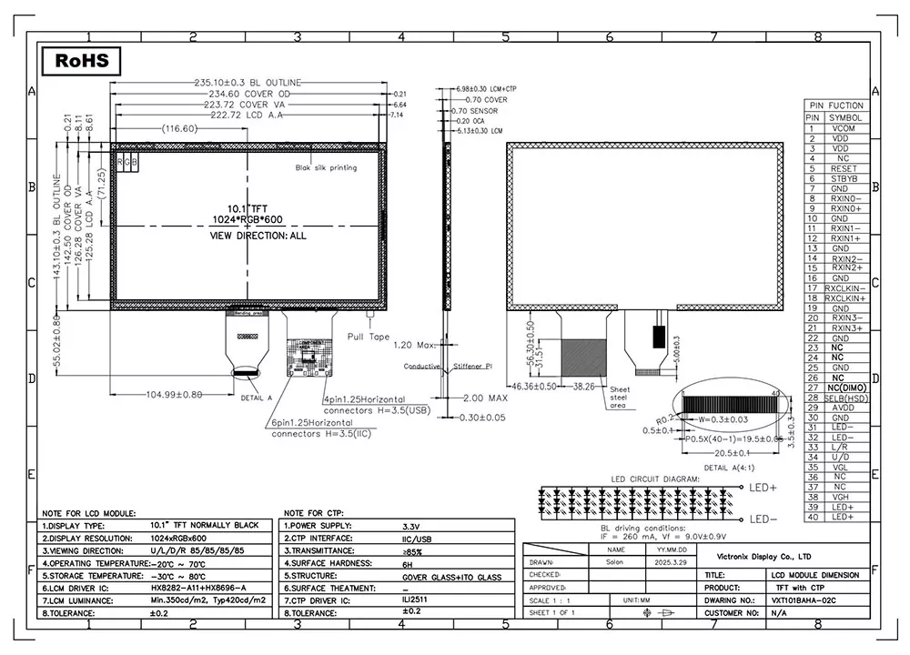 Di Zaman Kecerdasan, modul TFT memungkinkan kami untuk menyajikan data yang diperlukan secara visual. Kualitas modul TFT memiliki dampak penting pada aplikasinya. Apa keuntungan dari modul TFT Victronix 10.1 inci 1024 × 600 LVDS dengan CTP? Pada awalnya, kecerahan CD/m² 420, rasio kontras 800: 1, sudut pandang 80 derajat di semua arah, dan keseragaman 75% memastikan citra yang jelas. Kedua, mendukung antarmuka LVDS 6/8-bit dengan pengontrol HX8282A11+HX8696A dan panel sentuh kapasitif 5-poin yang kuat dengan pengontrol CTP ILI2511. Selain itu, ia memiliki lampu latar putih yang dipimpin 3 × 13 dengan umur 30.000 hingga 50.000 jam, memastikan kegunaan jangka panjangnya di berbagai aplikasi industri. Selain itu, ini sesuai dengan standar ROHS dan berhasil lulus uji reliabilitas yang ketat, termasuk guncangan termal, kelembaban, dan perlindungan ESD hingga 8kV udara dan kontak 4KV. Produk ini beroperasi secara efisien dalam suhu ekstrem mulai dari -20 ° C hingga +70 ° C dan dapat menahan kondisi penyimpanan parah dari -30 ° C hingga +80 ° C.