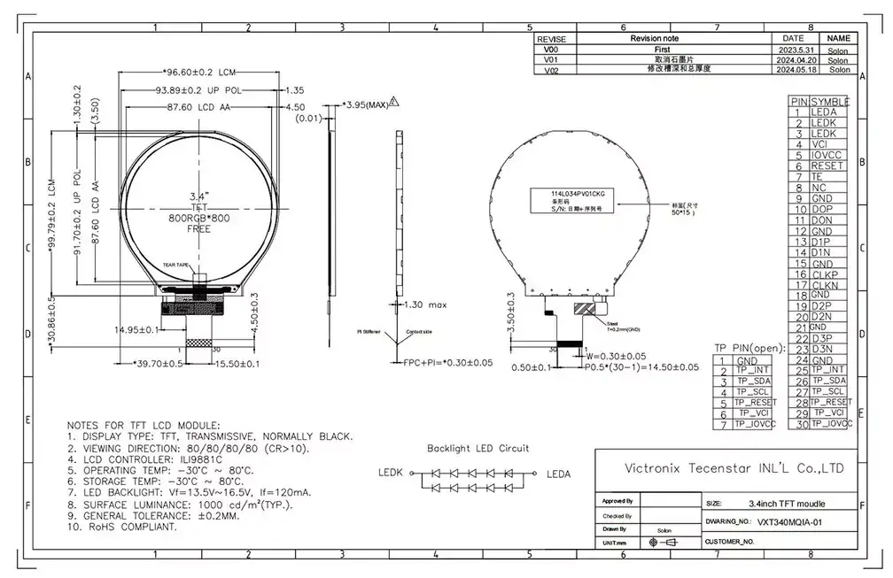 VXT340MQIA-01 adalah modul TFT-LCD. Ini terdiri dari panel TFT-LCD, IC driver, FPC, unit lampu belakang. The3.4 ¢ ¢ Area tampilan berisi 800x (RGB) x 800 piksel dan dapat menampilkan hingga 16,7m warna. Produk ini sesuai dengan kriteria lingkungan ROHS.