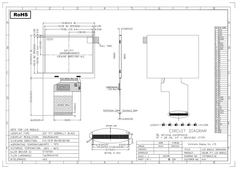 TFT LCD adalah jenis tampilan kristal cair yang menggunakan teknologi transistor film tipis untuk meningkatkan kualitas gambar, dan memiliki banyak aplikasi dalam kehidupan sehari-hari. Sebagai produsen dan pemasok modul TFT profesional di China, apa yang membuat modul TFT IPS IPS IPS Victronix 3,5 inci 320 × 240 berbeda dari produsen lain? Pertama, ia menawarkan kecerahan khas 300 CD/m², sudut pandang 80 ° lebar di segala arah, dan rasio kontras 800: 1, memastikan keterbacaan yang sangat baik dari berbagai sudut. Kedua, ini mengintegrasikan unit lampu latar yang menggunakan LED putih 6S dengan kehidupan khas 30.000 hingga 50.000 jam (hingga 50% kecerahan awal), memastikan visibilitas yang jelas dalam semua kondisi pencahayaan. Selain itu, ini mendukung antarmuka RGB 24-bit dengan pengontrol ST7272A. Selain itu, ia melewati pengujian lingkungan yang ketat, termasuk guncangan termal (-30 ° C ↔ +80 ° C siklus), penyimpanan kelembaban (60 ° C/90% RH), dan getaran mekanis, memastikan dapat beroperasi dengan mulus melintasi kisaran suhu yang diperluas (-20 ° C hingga +70 ° C).