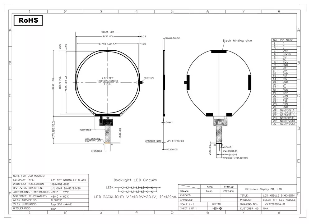 Victronix 7 Inch 1080 × 1080 Round IPS TFT LCD adalah modul tampilan TFT berkualitas tinggi 7 inci yang direkayasa untuk lingkungan industri yang menuntut. Menampilkan area aktif resolusi 1080 × 1080 yang unik (177,55 × 177,55 mm), modul ini memberikan visual yang tajam dan kesetiaan tinggi dengan 16,7 juta warna dan sudut pandang lebar (80 ° di semua arah). Desain kelas industri memastikan operasi yang andal dalam suhu mulai dari -20 ° C hingga +70 ° C, membuatnya ideal untuk otomatisasi, perangkat medis, dan instrumentasi. Sebagai produsen profesional dan pemasok modul TFT di Cina, modul TFT Victronix 7 inci ini sepenuhnya sesuai dengan standar lingkungan ROHS, memastikan kinerja aplikasi yang unggul. Kami menawarkan layanan khusus untuk memenuhi kebutuhan pelanggan kami.