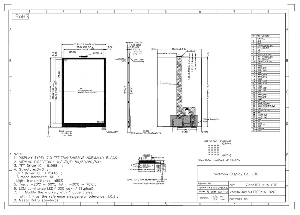 VXT700YIA-02C adalah modul TFT-LCD. Ini terdiri dari panel TFT-LCD, IC driver, FPC, lampu belakang dan CTP. Area tampilan 7.0 ¢ ¢ berisi 800 x (RGB) x 1280 piksel dan dapat menampilkan hingga 16.7m warna. Produk ini sesuai dengan kriteria lingkungan ROHS ..